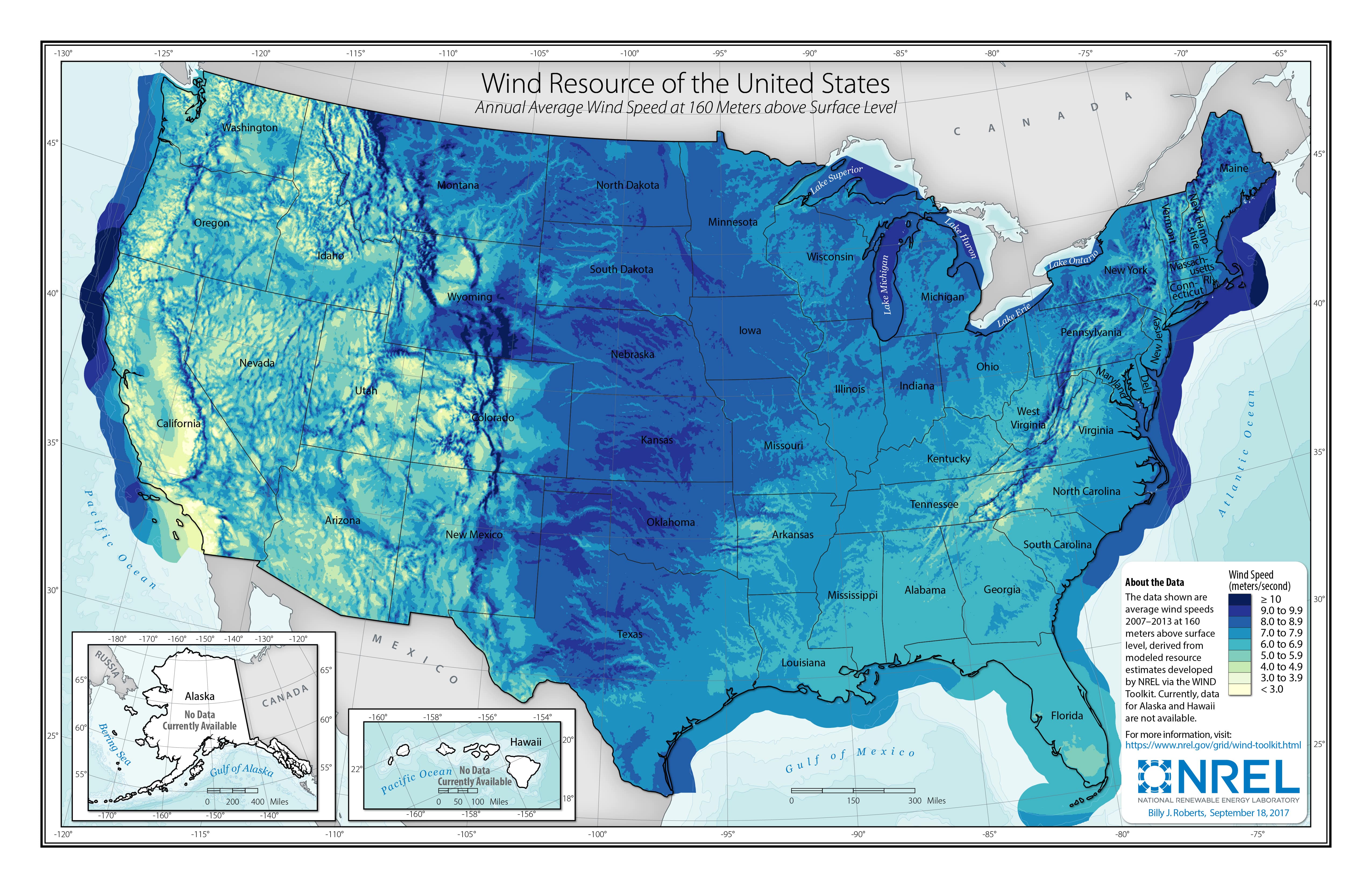 These static maps illustrate multiyear average wind speeds at various heights derived from NREL's WIND Toolkit. They may be used in electronic and printed publications with proper citation.
