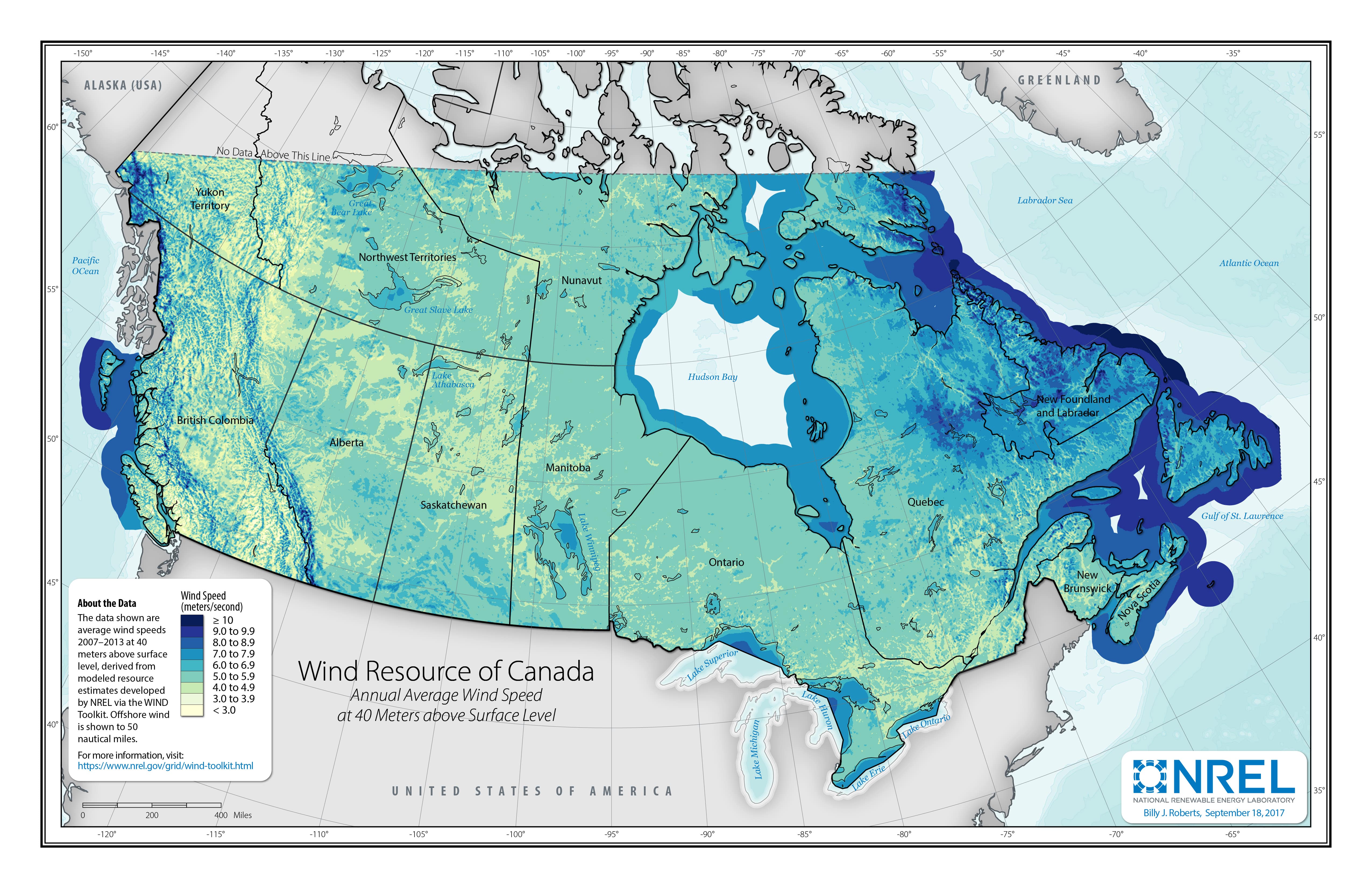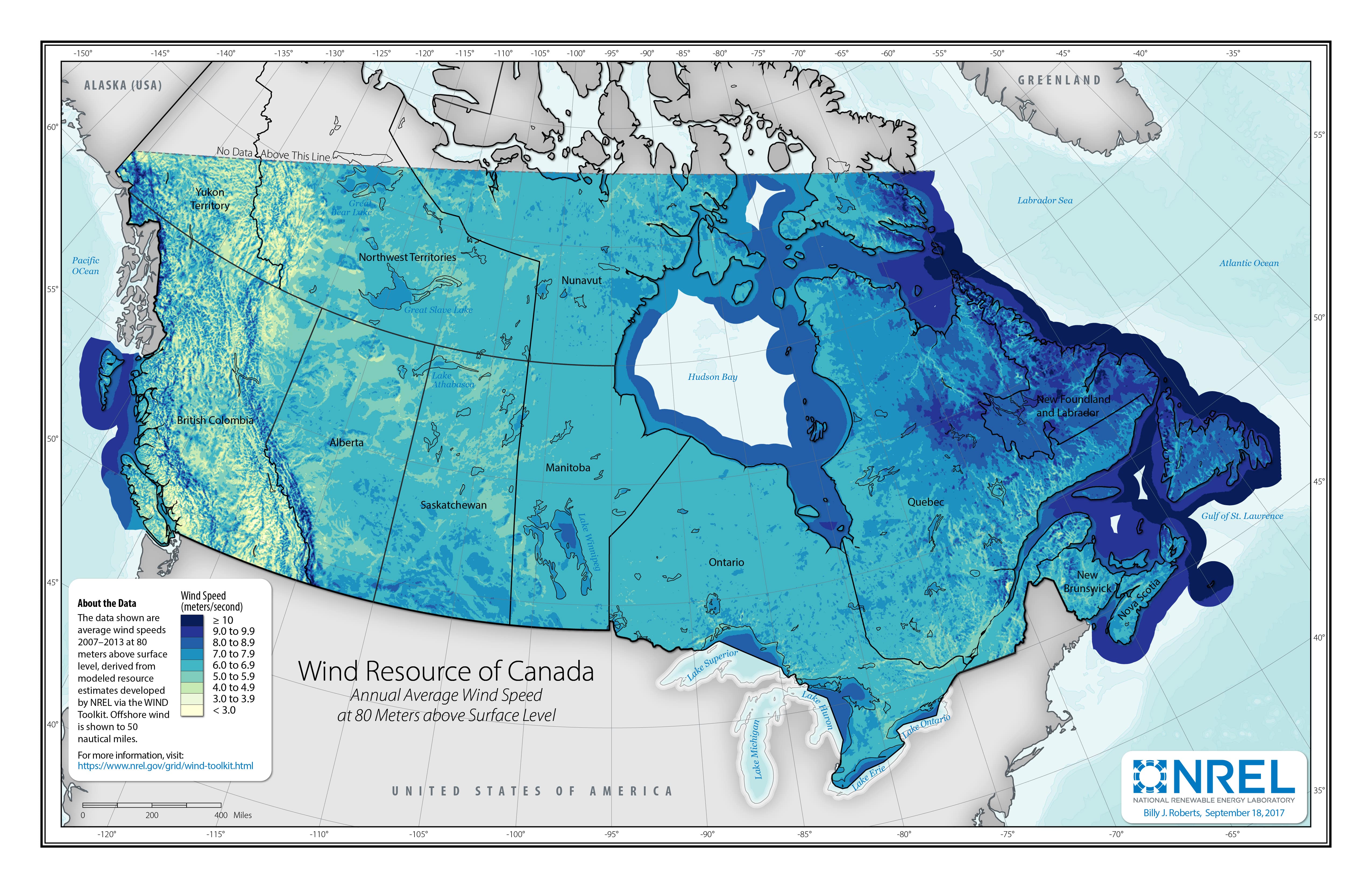 To make the maps above, multiyear average wind speeds were calculated from the WIND Toolkit. The contiguous United States, Canada, and Mexico are separate analysis regions and were thus calculated individually. These derived data sets are provided below as geospatial rasters.