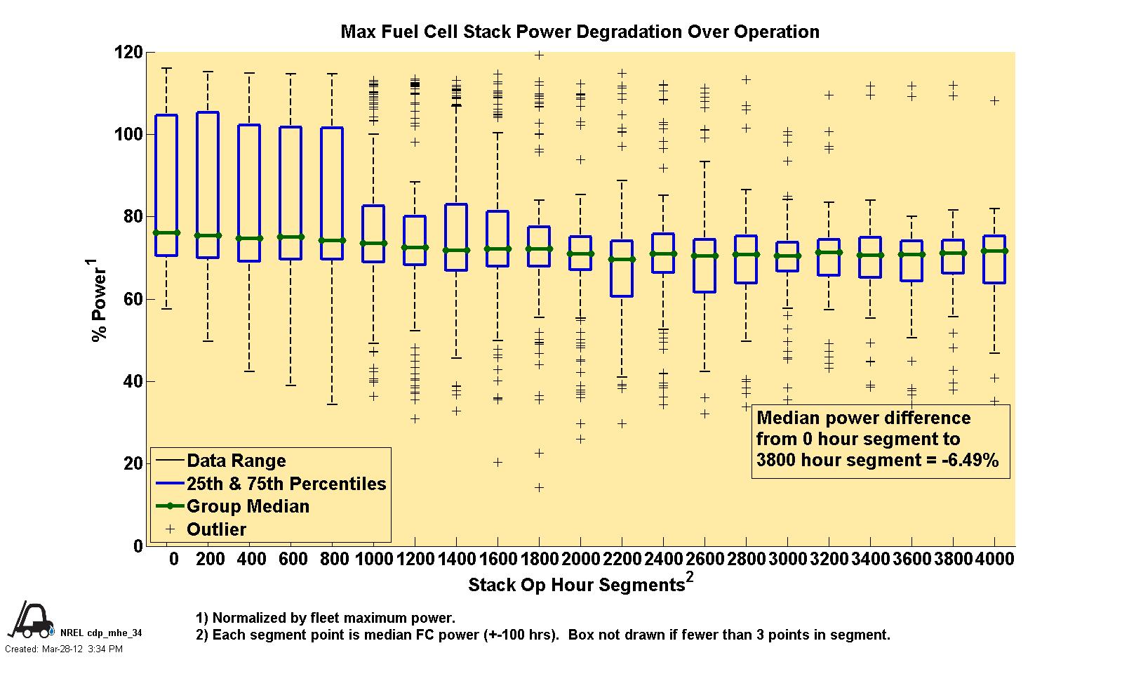 Fuel Cell Power Degradation Over Operation Time, CDP MHE 34, 3/28/2012